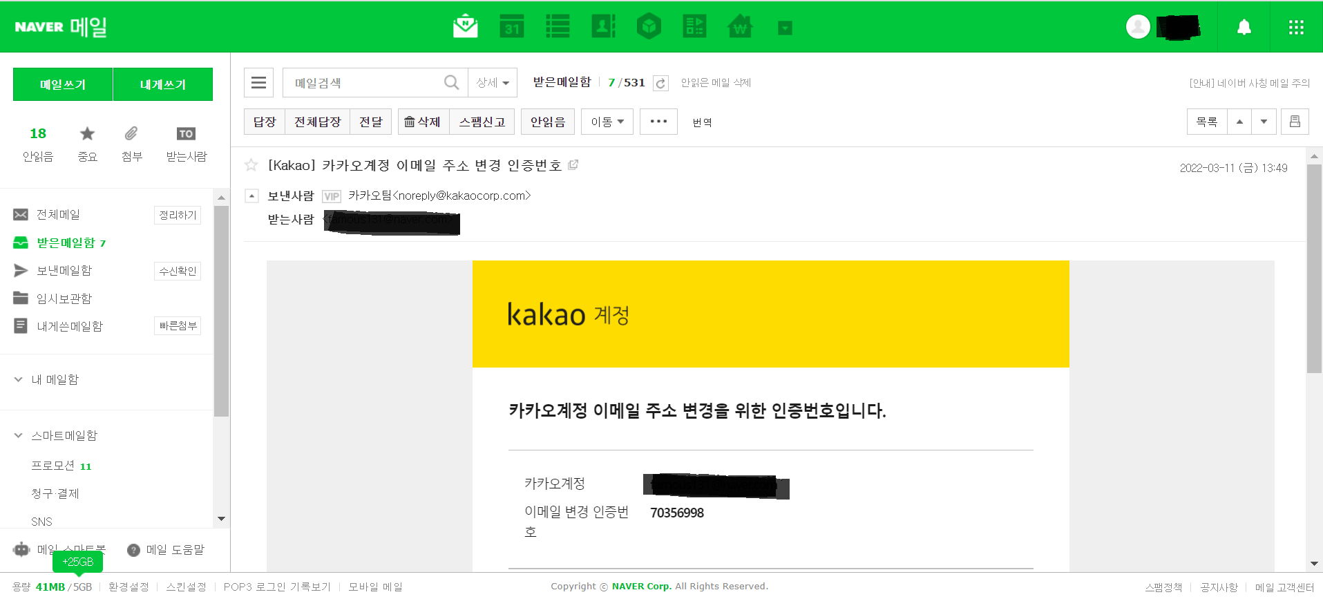 카카오계정으로 사용할 이메일 주소를 입력하면 인증 메일이 온다.