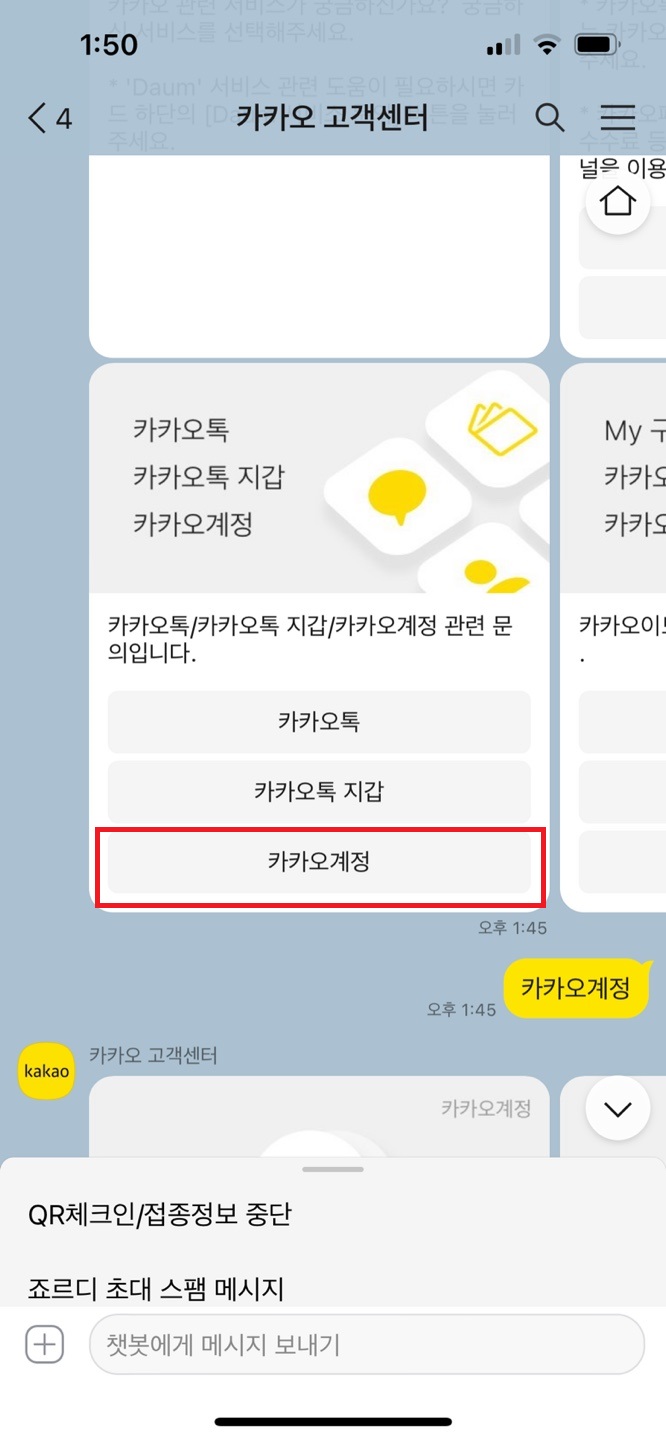 카카오톡에 로그인 한후 (설정 - 고객센터) 항목으로 들어간다.