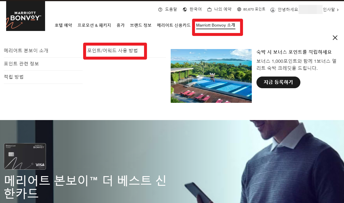 홈페이지 메인 화면에서 'Marriott Bonvy 소개' 를 누르고, '포인트/어워드 사용 방법' 을 찾아 누른다.