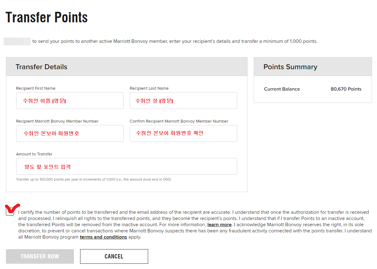 4. Transfer Points 페이지가 나온다. 양도할 사람에 대한 정보를 입력하고 Transfer 하면 된다.