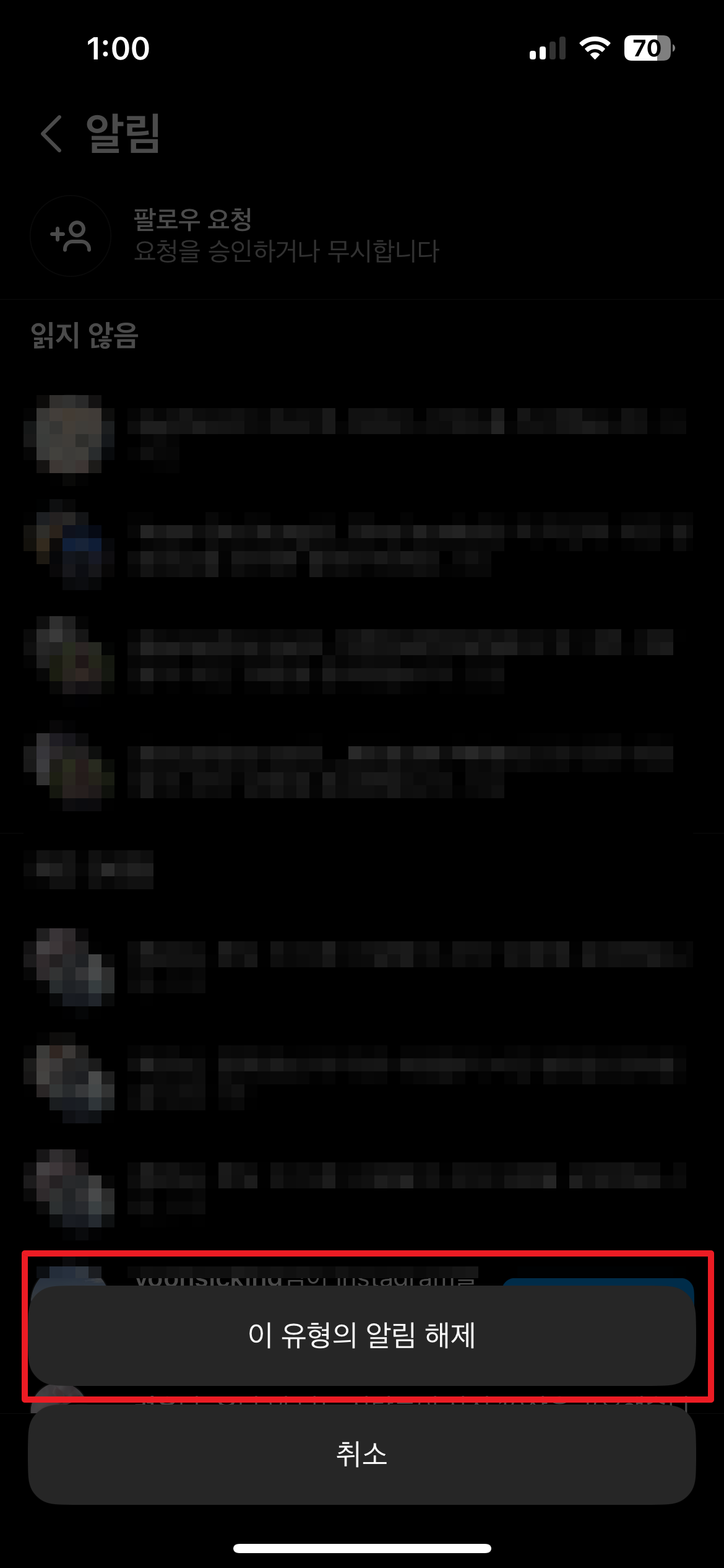 알림항목에서 해당알림을 받지 않도록 설정해주어야 한다.