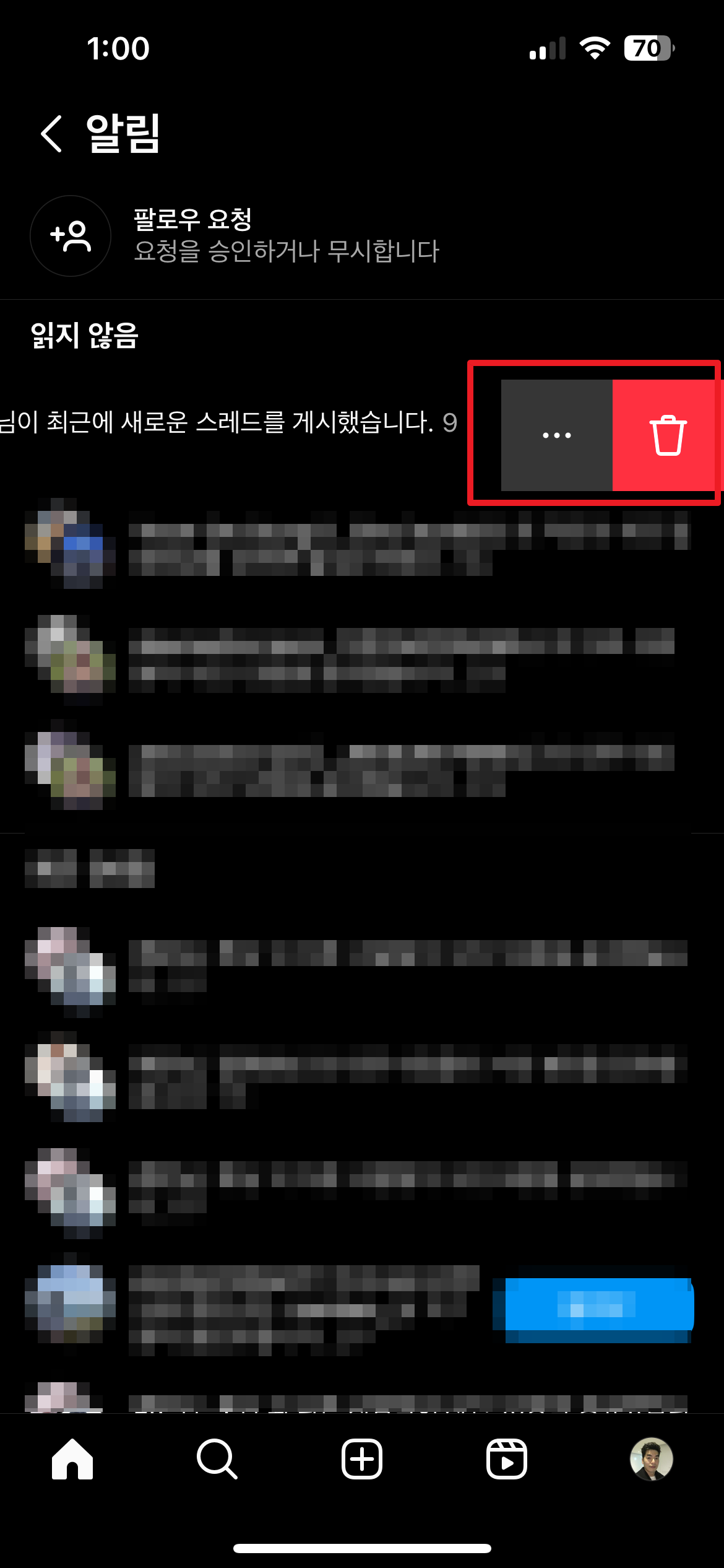 1. 인스타그램 우측 상단 하트 버튼을 눌러 알림 창으로 이동한다.