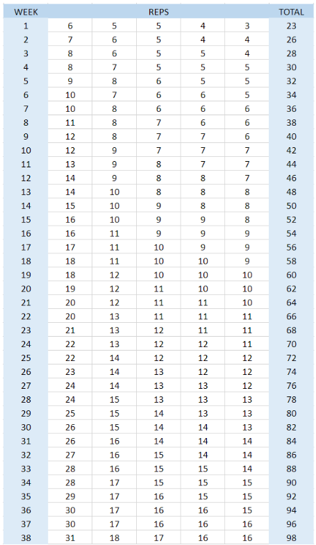 한주씩 세트당 횟수를 늘려가면서 점차적으로 토탈 개수를 늘려가는 방식이다.