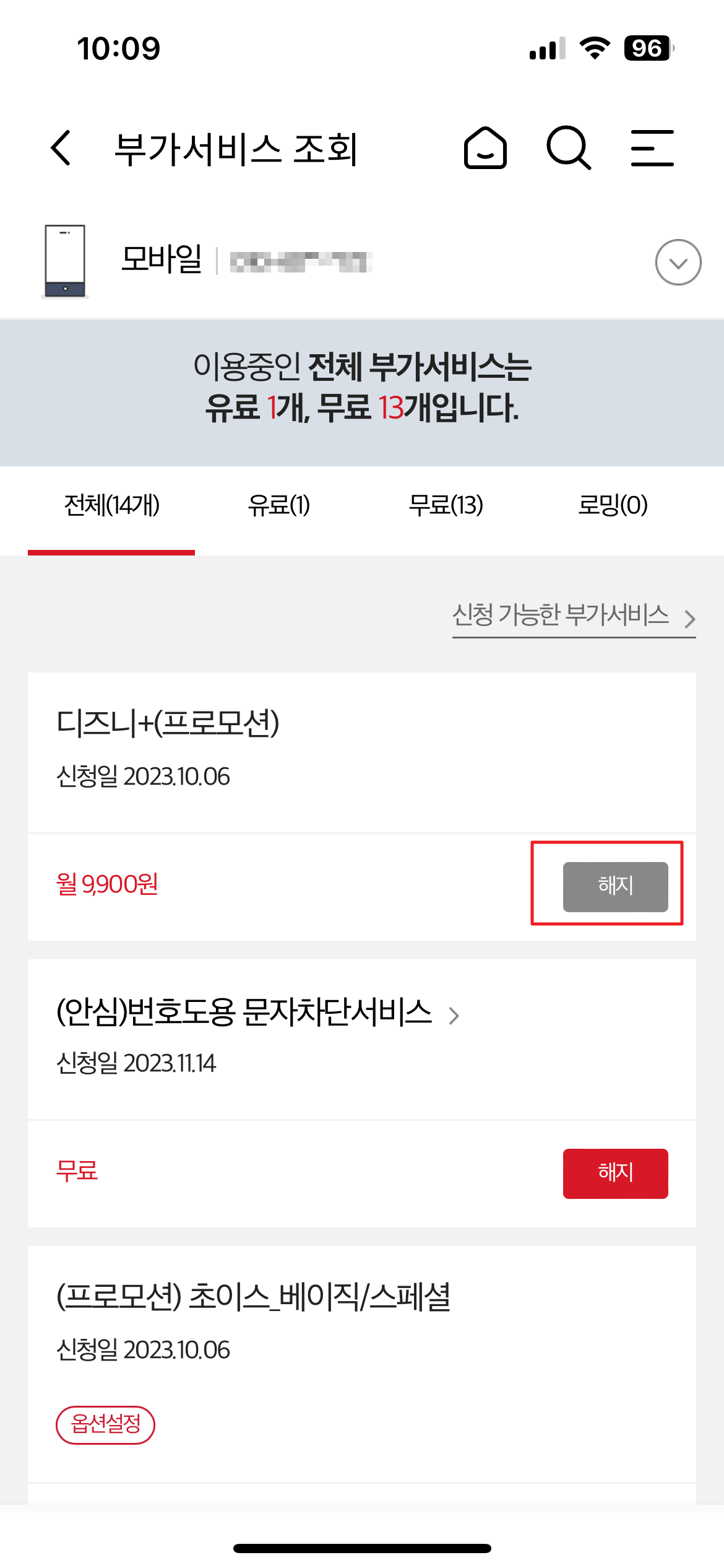 항목중에 디즈니+(프로모션) 이 보인다.