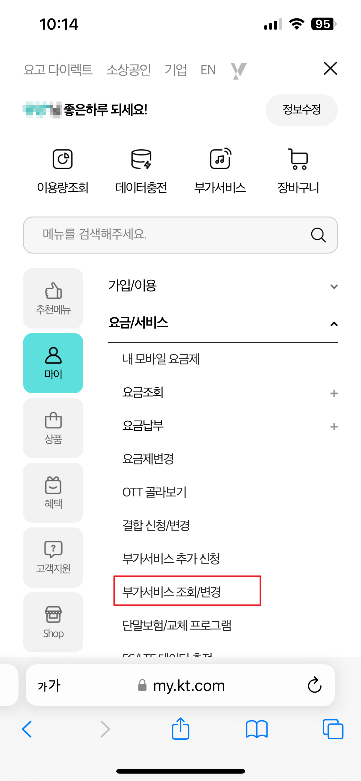KT App 에서 우측 상단 점세개 (전체매뉴) 선택 - 부가서비스 조회/변경 선택