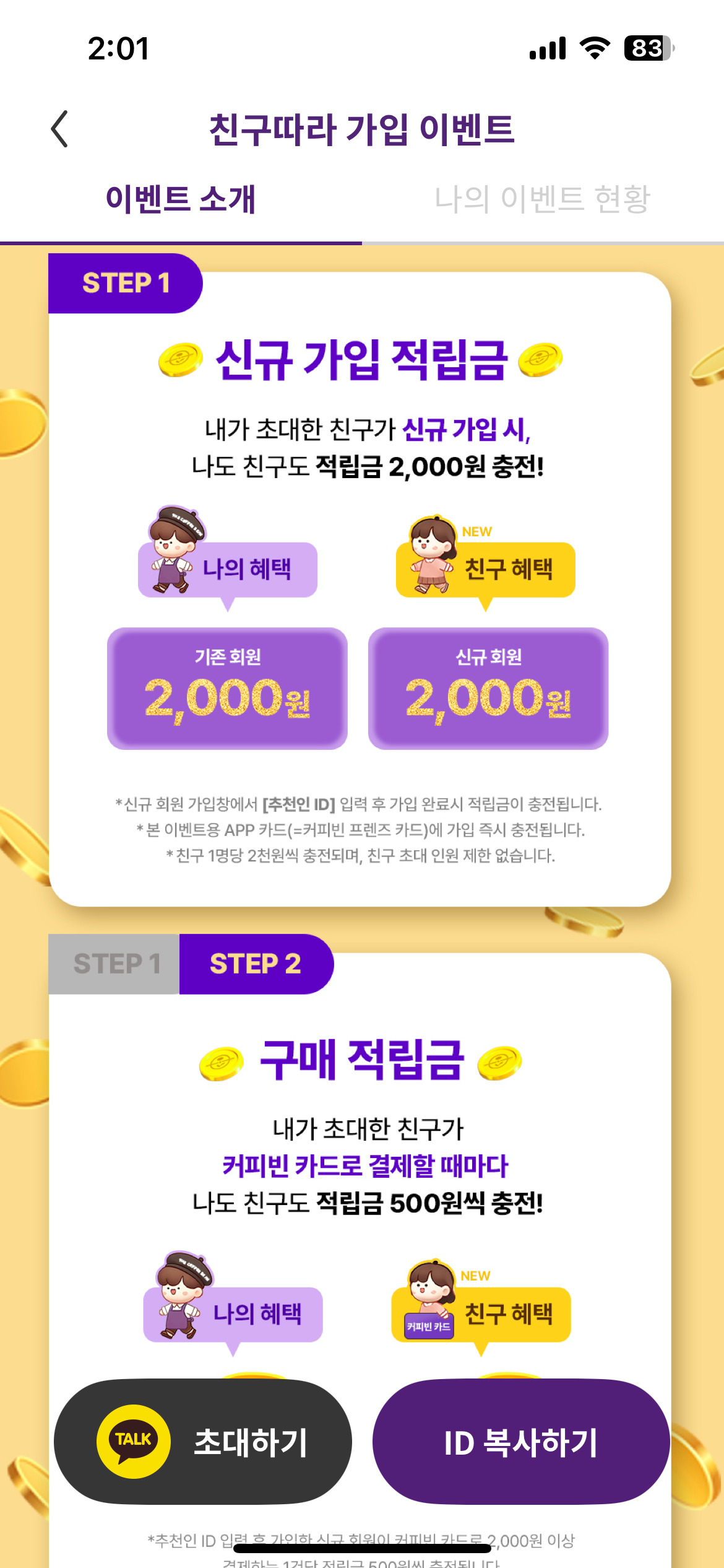 1. 가입시 초대 코드 입력하면, 초대한 친구도 나도 적립금 2,000원씩 충전!