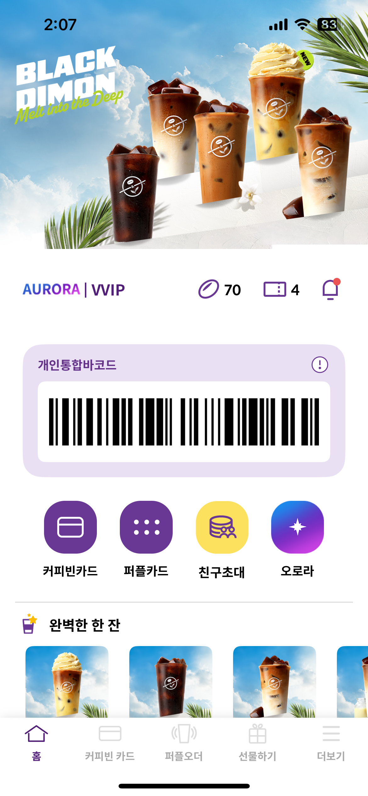 나는 커피빈을 좋아해서 VVIP를 수년째 유지중이며, 오로라 회원도 가입중이다.