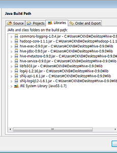 java4 package 안에서 jni 사용하기 JNI를 사용하는 자바의 클래스가 (default package)가 아닌 다른 package에 있을 경우 (package명이 달라지게 되면) exception 오류가 나게된다. 왜냐?? JNI에 대한 라이브러리를 생성할 때 package 명에 맞게 헤더파일을 생성해야 하기 때문이다.. ㅡㅡ 가령 패키지명이 포함된 클래스의 풀네임이 aaa.kkkclass이라면 (패키지명).(클래스명) 해당 클래스 파일을 컴파일 한 후, 커맨드를 aaa의 상위 폴더에 위치시킨 후 다음 명령어를 실행한다. >javah aaa.kkkclass 그럼 패키지명과 함께 적용된 헤더파일이 생성된다. 이제 dll 프로젝트에 헤더파일을 바꾸고 cpp파일의 함수명을 새로 생성된 헤더파일의 함수명으로 바꾸고 나니 패키지에 포함되어서도 정상적.. 2013. 3. 19. 이클립스 Save Failed 오류 해결 이클립스로 작업하다 다음과 같이 저장이 안되는 에러발생하였을 경우 Save Failed Compilation unit name must end with .java, or one of the registered Java-like extensions 디버거가 소스를 잡고있어서 그런듯하다. 브레이크 포인트를 모두 삭제하면 깔끔하게 해결된다. 2013. 3. 6. 자바 (JAVA) 설치 및 환경변수 설정하기 (쉬운설명) 자바 (JAVA) 설치 및 환경변수 설정해보자 자바 설치하기 오라클 사이트에 접속하여 자바를 다운로드 받는다. http://www.oracle.com/technetwork/java/javase/downloads/index.html 최신버전의 자바를 다운로드 받기위해 위 그림의 'Java Platform (JDK) DOWNLOAD' 버튼을 클릭한다. 이동 된 페이지에서 'Accept License Agreement' 를 클릭하고, 하단의 다운로드 리스트 중 자기PC의 운영체제(OS)에 맞는 링크를 클릭한다. 윈도우즈를 가장 많이 사용하는데 32비트 운영체제이면 'Windows x86' 을 64비트 운영체제이면 'Windows x64' 를 다운받으면 된다. 자신의 PC가 몇 비트 운영체제인지 모른다면 '내컴.. 2013. 2. 6. 이클립스에서 (java) hive thrift 연동하여 실행하기 이클립스에서 Hive Thrift 연동하기 이클립스에서 하이브 Thrift 연동하는 방법에 대해 알아보자. 관련 내용에대해 포스팅된 곳을 찾아보았으나 찾기가 쉽지 않아 직접 찾아낸 방법을 포스팅한다. 아침부터 적으려니 배고픔.. 하이브 설치가 안되어있다면 설치 먼저~ Hive (하이브) 설치 및 환경구축하기 이클립스에서 하이브 연동하기 이클립스에서 자바 프로젝트를 생성한 후 라이브러리를 추가한다. 생성된 프로젝트를 우클릭하여 'properties' 클릭 'Java Build Path - Libraries' 에서 'Add External JARs...' 클릭하여 다음 라이브러리를 추가한다. 추가해야할 라이브러리 목록 hive-jdbc-버전.jar hive-exec-버전.jar hive-metastore-버.. 2013. 1. 28. 이전 1 다음